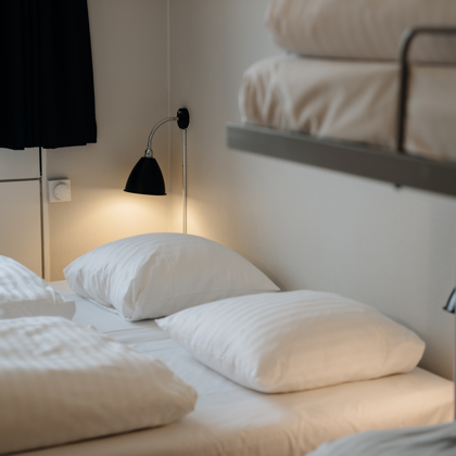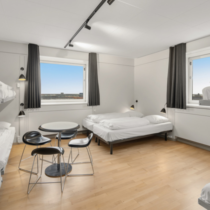 Er du enkeltrejsende, har vi fællesværelser, hvor du kan leje en seng. Hvis I rejser flere sammen, kan I booke et af vores privatværelser eller vores store ferielejligheder på 17. etage.