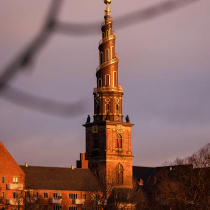 Dette spir, hvis ydre er dekoreret med en snoet trappe rejser sig stolt 90 meter over byen og har været et symbol på Københavns skyline gennem århundreder. Besøgende kan bestige de 400 trin, hvoraf de 150 trin er på ydersiden og nyde en enestående panorama udsigt over byen. Indvendigt byder kirken på en imponerende indretning med overdådige udsmykninger og detaljeret snedkerarbejde.