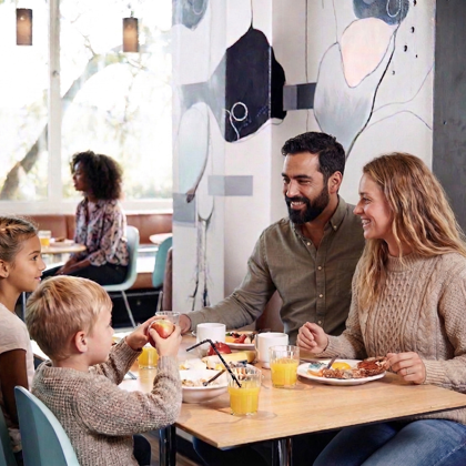 Vi har barnestoler, barnevennlig mat og drikke samt stellefasiliteter. Kaféen vår har åpent alle dager fra kl. 7-24. Vi gjør dog oppmerksom på at det på travle dager med mange mennesker ikke kan garanteres barnehjørne før etter frokostbuffeen. Det vil si etter kl.10.